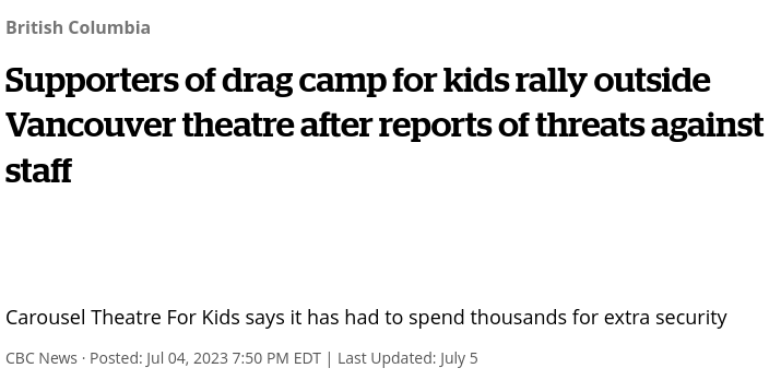 — Supporters of drag camp for kids rally outside Vancouver theatre after reports of threats against staff, CBC News (Jul. 4, 2023)