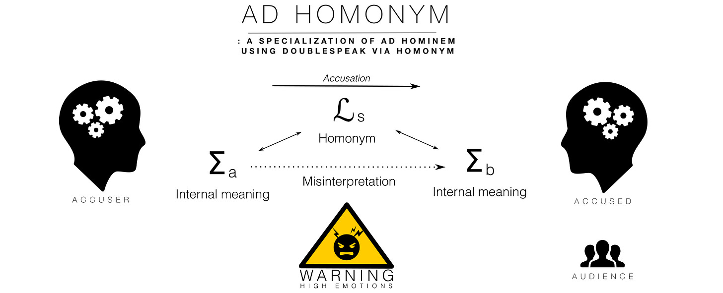 The ambiguous words “hate” and “threat” are used in a specialization of ad hominem that I ironically call ad homonym. These are words that sound or spell the same, but have different meanings, which get used in character attacks to confuse an audience. Hate may mean “a conflicting idea,” and threat may mean “persecution.”