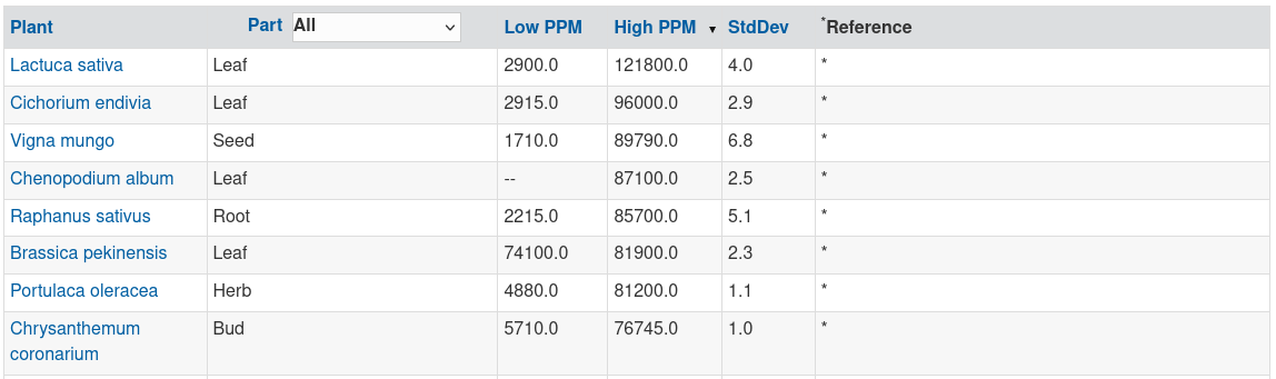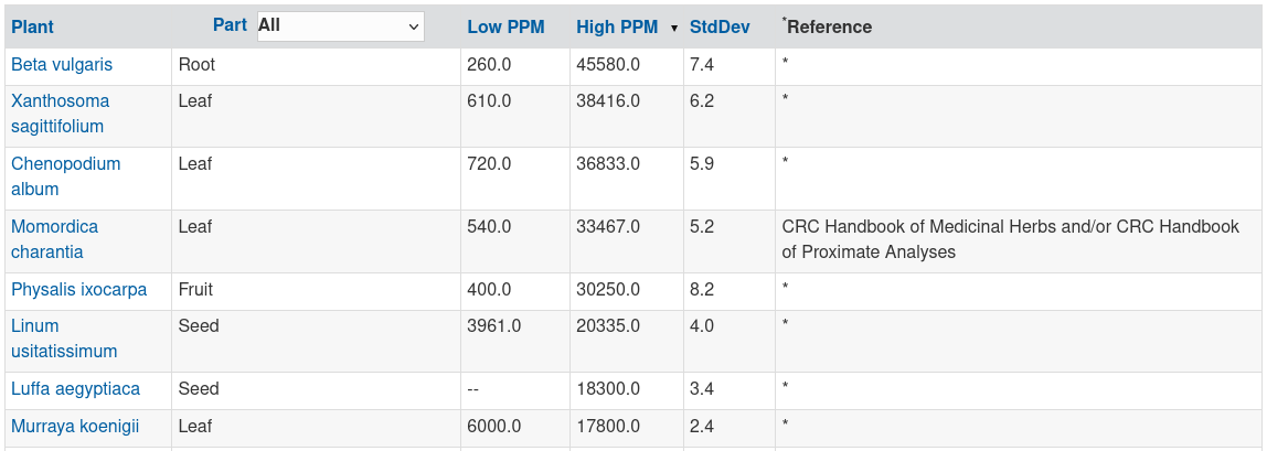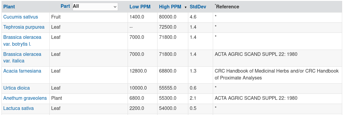 The U.S. Department of Agriculture has a public database containing thousands of plants cross-referenced with chemicals called Dr. Duke's Phytochemical and Ethnobotanical Databases. The following screenshots are searches for Nitrogen, Phosphorous and Potassium sorted by High PPM clipped at the first 8 entries.