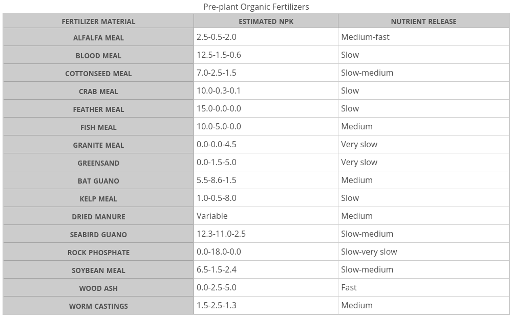 Below is a table listing typical organic fertilizers used before planting crops.