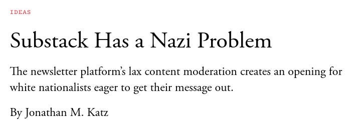 — Jonathan M. Katz, Substack has a Nazi problem (Nov. 28, 2023)