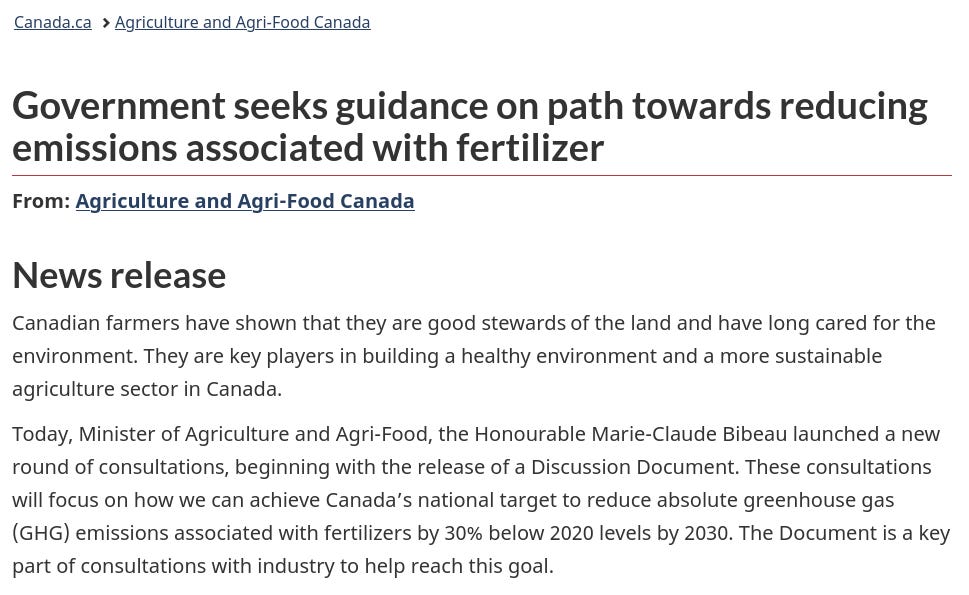 Government of Canada (Mar. 04, 2022). Agriculture and Agri-Food Canada: Government seeks guidance on path towards reducing emissions associated with fertilizer. https://www.canada.ca/en/agriculture-agri-food/news/2022/03/government-seeks-guidance-on-path-towards-reducing-emissions-associated-with-fertilizer.html